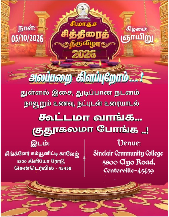 Celebrate the spirit of togetherness and tradition at Chithirai Thiruvizha 2026! Join us on May 10th for a vibrant gathering filled with joy, culture, and community bonding. This special occasion brings families and friends together to cherish our roots, share happiness, and create beautiful memories.